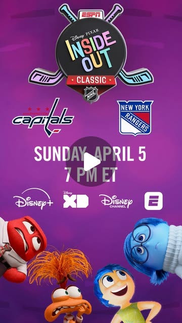 ESPN, Disney, Pixar y la National Hockey League presentarán Inside Out Classic, una transmisión animada en tiempo real del partido entre Washington Capitals y New York Rangers el 5 de abril.